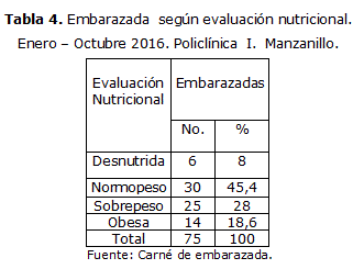La tabla 4, expresa la evaluación nutricional de las gestantes. Los valores predominantes fueron para las normopeso y sobrepeso con 45,3 % y 28 % respectivamente.