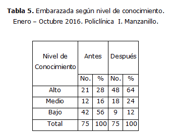 En la tabla 5, se representa el comportamiento del nivel de conocimiento respecto a la prevención de los trastornos hipertensivos en el embarazo, se comportó predominantemente bajo en la fase inicial del estudio (56 % del total) la que se modificó notablemente hacia el calificativo de alto, luego de la aplicación del programa educativo (64 %).