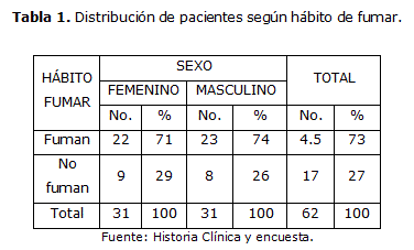 De los 62 pacientes en el Servicio de Rehabilitación, 45 pacientes (73%) fuman (tabla 1).