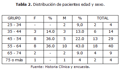 Predominaron los grupos etáreos de 55-64 años y 45-54 años, con el 40% y29% respectivamente, lo que se explica por la edad de comienzo de la enfermedad, la evolución crónica de esta, en cuanto a sexo no hubo diferencias (tabla 2).