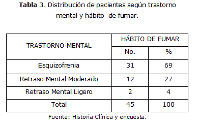 Se realizó un estudio descriptivo-prospectivo a los 62 pacientes en hospitalización crónica del Hospital Psiquiátrico Provincial Docente «Comandante Manuel Fajardo Rivero, de Manzanillo con el objetivo de determinar el hábito de fumar y los procesos respiratorios en los mismos. Se aplicó una encuesta para obtener los datos del hábito de fumar y los procesos respiratorios, además se revisaron las historias clínicas. Entre los resultados obtenidos tenemos que de los 62 pacientes, 45 fuman, las edades oscilan entre los 55 64 años y 45 a 54. La esquizofrenia y las infecciones respiratorias agudas fueron las patologías más frecuentes.
