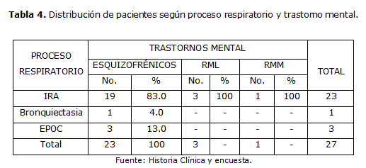 Los procesos respiratorios más frecuentes fueron las infecciones respiratorias agudas con 23 casos (85 %) (tabla 4).