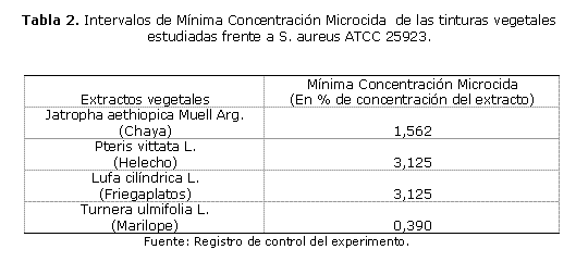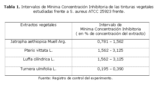 Mediante los ensayos in vitro para evaluar la susceptibilidad de la cepa bacteriana frente a los extractos ensayados se determinó que la tintura de Pteris vittata L., (Helecho); Luffa cylindrica L (Roem). (Carolus Linnaeus. (Friegaplatos) presentaron actividad más relevante contra S. aureus con una CMI cuyo intervalo se define por los limites inferiores de 0,39 0,781, y limites superiores de 1,562 3,125 para Pteris vittata, mientras que Luffa cylindrica posee un intervalo desde 0,195 - 0,39 hasta 1,562 3,125 % de tinturas. Según NCCLS, en su anexo M7-A3, la mínima concentración inhibitoria no debe ofrecerse como una cifra única. Dicho patrón internacional plantea que MCI deberá interpretarse como la mínima dilución donde se produce el fenómeno de que, la sustancia o droga probada durante la experiencia, inhibe el crecimiento microbiano, pero el verdadero MCI reside en el intervalo creado por esta dilución y el valor inmediato superior. 1, 5