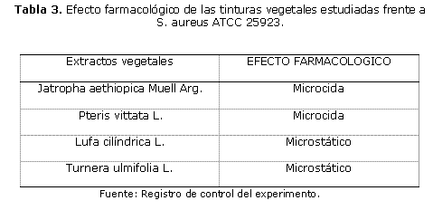 To obtain that the Cuban population has strictly studied phytopharmaceuticals has been the goal of many researchers. For this reason, the present study evaluated the antimicrobial in Vitro activity of tinctures obtained from plant species: Jatropha aethiopica Muell arg., Pteris vittata l., l. and cylindrical Luffa Turnera ulmifolia l., with the aim of establishing patterns of minimum inhibitory concentration, minimum microcid concentration and microcid or microstatic behavior of them towards the S. aureus ATCC 25923 control stock. The results obtained evidenced that tinctures from leaves of Pteris vittata L and the elaborated from the fruit of Luffa cylindrical L developed a better inhibitory activity against this strain. Pteris vittata L and Luffa cylindrical L developed its activity to the 3,125% obtained tincture. On the other hand Pteris vittata, carried out a microcid action while Luffa cylindrical performed a microstatic way