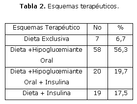 Con relación a los esquemas terapéuticos se encontró que el 56,3 porciento de los ancianos empleaban dieta e hipoglucemiantes orales para el control de su enfermedad (56,3 %), seguido en orden de frecuencia por la combinación de la dieta, los hipoglucemiantes orales más la insulina ( 20 casos; 19,5 % ) tabla 2.