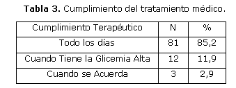 Se puede observar que del total de 96 ancianos diabéticos con tratamiento farmacológico, el 85,2 % cumplían adecuadamente con el tratamiento médico, al presentar una frecuencia diaria en su administración medicamentosa, tabla 3.