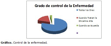 Finalmente, en el gráfico se presentan los resultados en cuanto al grado de control de la enfermedad, apreciándose que el 85,2 % gozaba de un control metabólico ideal, el 19,2 porciento presentaba un control aceptable, y solo el 2,9 % tenía descontrol severo.