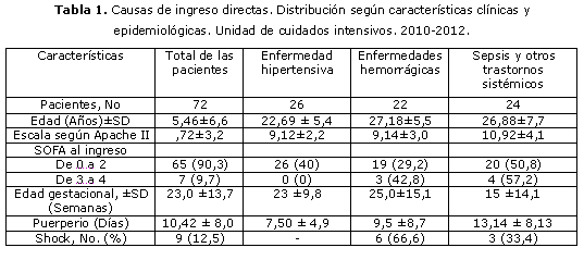 En la tabla 1 se exponen las características clínicas y epidemiológicas de las pacientes con causas directas de morbilidad. Se observó un discreto predominio de la enfermedad hipertensiva 26 pacientes (36,1 %), fundamentalmente en mujeres de menor edad (promedio de 22 años, DE ± 6 años). Las pacientes de mayor edad tuvieron diagnóstico de enfermedad hemorrágica (media de 27 años, DE ± 5 años). El promedio de la escala de APACHE II estuvo por debajo de 10 en todos los grupos diagnósticos. La mayoría de las maternas se ubicaron en los primeros estadios del SOFA; solamente 7 (9,7%) pacientes clasificaron en el 3 y 4. La generalidad de las pacientes que presentaron causas directas necesitó ingreso antes de las 24 semanas y en los primeros diez días del puerperio; con una desviación estándar de 8,0 días es que se presentaron las complicaciones que precisaron ingreso en UCI. Por último, solo el 12,5% de las obstétricas tuvieron un estado de shock previo.