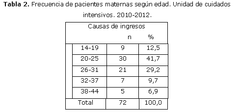 Durante el periodo de estudio 2010 al 2012 ingresaron en la institución 37585 pacientes obstétricas, de ellas 208 (0,55 %) ingresaron en la UCI y 72 (34,6 %) por causas directas relacionadas con el embarazo. Se observó poca variación en la incidencia acumulada por años.