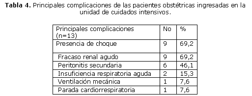 El 18 % de las pacientes ingresadas en la UCI presentó complicaciones; las más frecuentes se represen en la tabla 4. Se destaca la presencia de shock e insuficiencia renal aguda en el 69,2 %de las pacientes complicadas, seguida de la peritonitis secundaria en 46,1 %.