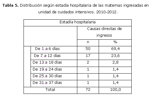 En la tabla 5 se muestra la estadia de las maternas graves de causas directas ingresadas en la UCI donde el 93% tuvo una estadia inferior a 12 días y 69,4% se mantuvieron entre 1 y 6 días este servicio.