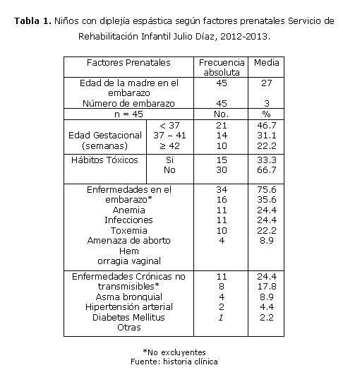 En la tabla 1, se pudo apreciar que la media de la edad de las madres fue 27 años donde el embarazo correspondiente al del niño afectado ocupó según número de embarazo de la madre, el tercero en promedio. La edad gestacional con menos de 37 semanas se evidenció en 21 madres de estos niños (46.7%), en tanto que la mayoría no practicaban hábitos tóxicos (66.7%). En 75.6% de dichas madres presentaron enfermedades durante el embarazo, siendo la anemia la más frecuente (35.6%). Dentro de la morbilidad referida a crónicas no transmisibles, se tuvo en 11 (24.4%) y fue el asma bronquial la de mayor frecuencia (17.8%) y se presentó el bajo peso en un menor número de ellas (31.1%).