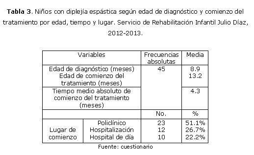 Como promedio la diplejía espástica se diagnosticó a los 9 meses aproximadamente y se inició el tratamiento alrededor de los 13 meses, por lo que el tiempo medio transcurrido desde el diagnóstico hasta el comienzo de la rehabilitación es 4 meses, mayormente en el policlínico (51.1%) tabla 3.