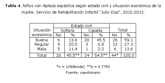 Al considerar el estado civil de las madres, no se evidenció diferencia significativa (p = 0.7750) entre la proporción de casadas y solteras. En más de la mitad de dichas madres (59.1%) la situación económica era buena que se distribuyó con mayor frecuencia en las casadas (45.5%) tabla 4.