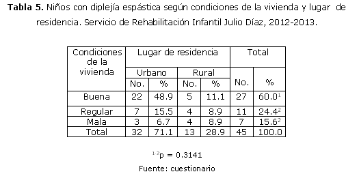 La mayoría de los niños estudiados residen en zonas urbanas (71.1%) con buenas condiciones en la vivienda en 22 de ellos (48.9%); aunque si se tienen en cuenta las categorías para las condiciones de la vivienda, las buenas (60.0%) no se diferenciaron significativamente (p = 0.3141) respecto al caso contrario, correspondientes en el análisis conjunto, regular y mala tabla 5.