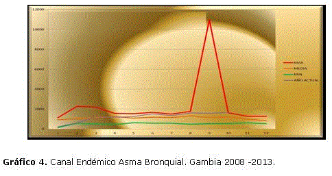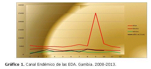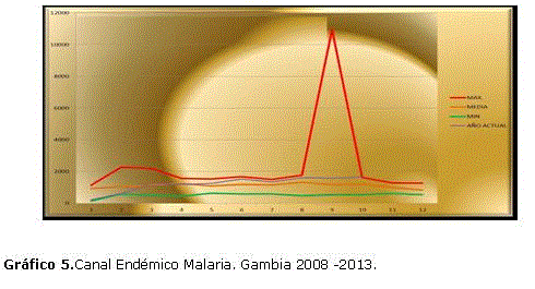 El canal endémico creado por Selwyn Collins en 1932 para la vigilancia de las epidemias de influenza y muy utilizado desde entonces debido a la sencillo de su confección e interpretación, es una herramienta que permite conocer el comportamiento y evaluar la naturaleza endémica o epidémica de una enfermedad, es una herramienta esencial para el trabajo que realiza nuestra brigada médica en Gambia y constituye una representación gráfica de la incidencia actual sobre la incidencia histórica y permite detectar precozmente cifras anormalmente altas o bajas de casos de la enfermedad en estudio y así tomar las acciones necesarias encaminadas a controlar y/o minimizar sus efectos, y la adecuación de los recursos humanos y materiales necesarios. 9-10