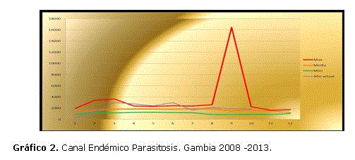 La información fue recogida de los registros estadísticos de la Misión Médica Cubana en Gambia, comprendidos entre los años 2008 hasta agosto del 2013. Los datos fueron procesados en computadora personal, como medidas de análisis estadístico se utilizaron las tasas y números absolutos; para su mejor interpretación se llevaron a corredores endémicos (canales endémicos o curvas de expectativas) utilizando el paquete de programas Epidat 3.1.