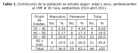 En la tabla 1, Se pudo observar que en el grupo estudiado existió un predominio del sexo femenino con 29 pacientes para un 63.1%; siendo el grupo de edad de 60 y más en ambos sexos con 26.0 % para el sexo femenino y 19.5.3% el masculino.