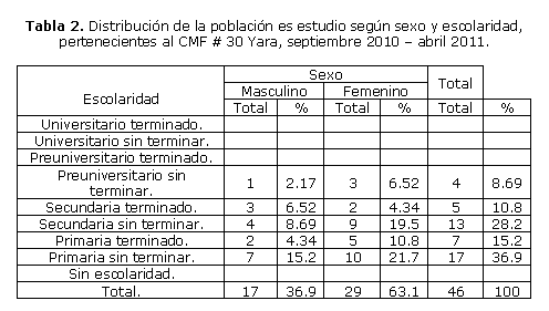 La tabla 2 muestra el nivel de escolaridad de la población diabética donde se observa que el 36.9% de los pacientes no tenía aprobado el nivel primario de enseñanza, con el 15.2% los del sexo masculinos y el del sexo femenino con 21.7%.