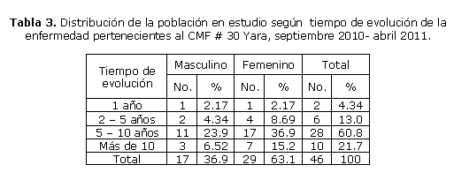 3. Predominó en los pacientes el tiempo de evolución entre 5 y 10 años en ambos sexos.