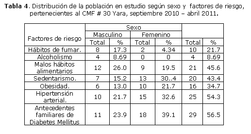 4. En ambos sexos sobresalieron los factores de riesgos: antecedentes patológicos familiares de Diabetes Mellitus, Hipertensión Arterial, malos hábitos alimentarios, sedentarismo y obesidad.
