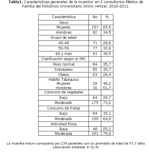 La muestra final quedó formada por 239 pacientes, de ellos 54,5% pertenecieron al CMF-1 y 45,5% al CMF-2 del policlínico universitario Jimmy Hirtzel. Las características generales de la muestra se presentan en la tabla 1, en la cual se destaca el predominio de sujetos del sexo femenino (65.5%), así como dentro de los hábitos alimentarios y estilos de vida se encontró que el consumo de vegetales, frutas y los niveles de actividad física eran mayoritariamente moderados (73.2%, 64.8% y 79.9% respectivamente).