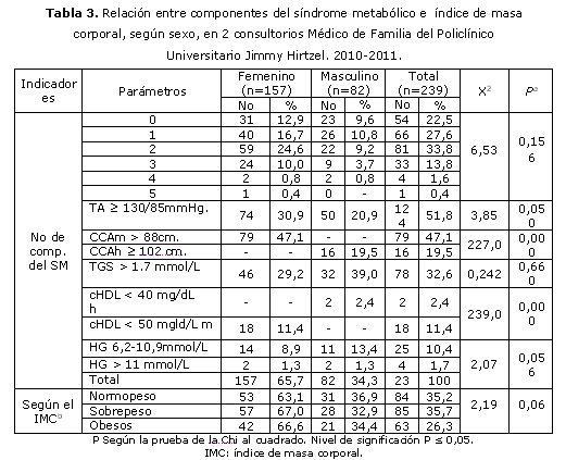 La relación entre el número de elementos del SM y el sexo tabla 3 no tuvo significación estadística (X2= 6,553; p=0,156). Resultó significativo la relación de la cintura abdominal (X2=239; p=0,000), el colesterol cHDL (X2=227; p=0,000) y las cifras de tensión arterial (X2=3,853; p=0,050) con el sexo.