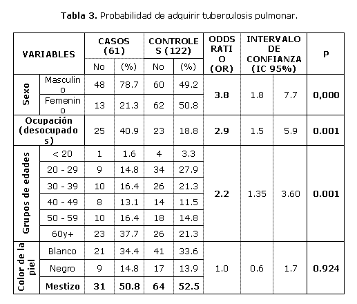 En la tabla 3, la probabilidad para los hombres es mucho mayor de adquirir la tuberculosis pulmonar que las mujeres con valor de tres veces más (OR=3.8 y p<0.05), la variable ocupación arrojó un mayor riesgo para los desocupados de casi tres veces más (OR=2.9) y una p<0.05 siendo significativo, la edad para los mayores de 60 años, destacan un riesgo de 2 veces más de adquirir una tuberculosis pulmonar que los otros grupos de edades. En el caso particular del color de la piel no mostró evidencias estadísticas de asociación con la tuberculosis pulmonar p>0.05 y OR de uno.