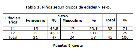 Al analizar la relación entre la edad y el sexo de los adolescentes estudiados se observó que el mayor por ciento (71%) se encontraba en los 11 años predominando en género el sexo masculino con un 53% y en los 12 años con un 13% tabla 1.
