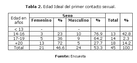 El mayor por ciento de adolescentes de ambos sexo respondió que la edad ideal para tener la primera relación sexual debe ser a los 20 años aunque el sexo masculino manifestó que su primer contacto sexual debería ser entre los 13 y 14 años. La información de los jóvenes sobre temas de salud reproductiva tiene valor desde el punto de vista de su seguridad, a pesar de las controversias, sobre si ésta los anima a tener relaciones sexuales a una edad más temprana y a ser promiscuos.