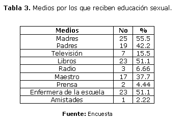 Con relación a los medios por los que recibieron educación sexual, el 97.7 % de los padres jugó el rol fundamental y desempeñó una ardua labor educativa las madres con un 55.5%, representados en la tabla 3. La enfermera de la escuela y los libros le siguieron en orden con 51.1% seguido de los maestro con un 37.7%.