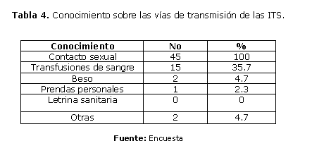 En la tabla 4 se demuestra que existe tanto en hembras como varones desconocimiento de todas las vías por las que se transmiten las Infecciones de transmisión sexual (ITS), y cuáles son estas enfermedades, incluyendo en sus respuestas el cáncer. Es significativo también destacar que la vía de las relaciones sexuales protegidas fue la más identificada como forma de evitar las ITS, y se desconocen las transfusiones de sangre como otra vía, sin embargo identifican como otras vías de transmisión el beso y el uso de la letrina sanitaria, consideramos que se necesita preparar a estos niños en este sentido, pudimos corroborar que existen muchos tabúes sobre el tema y desconocimiento de términos que incluso en ocasiones temen nombrar, por pena, lo consideran malo, feo, que lo regañen, son temas para cuando sean grande.