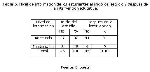 El nivel de información de los estudiantes al inicio del estudio se evaluó de inadecuado en el 87%. En la tabla 5 se aprecia un desarrollo después de la intervención de los conocimientos que se reciben acerca de la sexualidad en un 91%, lo que se considera se deba a la calidad con la que se impartieron los temas y la acogida que tuvo en el grupo de adolescentes. Se logró la motivación de la mayoría de los estudiantes lo que se constató con un aumento significativo de los resultados en los estudiantes ubicados en la categoría de adecuada al final del estudio, representados por el 91%.