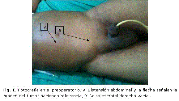 Se ingresa de urgencia con el diagnóstico de oclusión intestinal mecánica por tumor abdominal. Se indican medidas para descomprimir el intestino, se corrigen los trastornos hidroelectrolíticos y ácido básico, y se administran antimicrobianos; a las 6 horas se repite radiografía de abdomen simple donde se mantiene el patrón oclusivo y se decide operar de urgencia con el diagnóstico presuntivo de oclusión intestinal por tumor testicular intrabdominal.