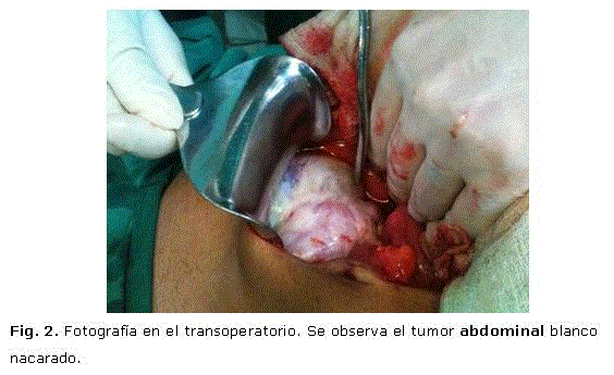 En la laparotomía exploradora se corrobora la distensión de asas intestinales delgadas y gruesas hasta la unión rectosigmoidea provocada por un gran tumor retroperitoneal blanco nacarado que infiltra la pelvis y el recto, que resultó irresecable, permitiendo sólo toma de biopsia incisional del tumor y transversostomía con fines descompresivos. El paciente tuvo una adecuada evolución postoperatoria y fue egresado siete días después con seguimiento por consulta externa de oncología. (Fig. 2)